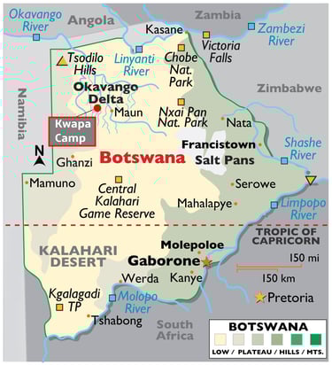 Botswana is a peaceful and democratic country in Southern Africa, known for its vast, sunbaked plains, endless skies and the quiet stillness of the Kalahari Desert. It borders South Africa, Namibia, Zambia, and Zimbabwe.